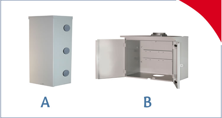 Fabricadas con lámina galvanizada con tratamiento de pintura polvo color gris, aplicada a alta temperatura. Incluye agujeros para paso de cables de potencia y de medición. Diseño de uso interior. Dimensiones: 36” Alto, 12” Ancho y 10” Fondo.